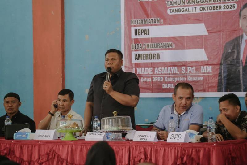 Ketua DPRD Konawe, I Made Asmaya Saat Melakukan Reses di Balai Desa Ameroro.(Foto:ist). IKONSULTRA.COM : KONAWE – Ketua Dewan Perwakilan Rakyat Daerah (DPRD) Kabupaten Konawe, I Made Asmaya, melaksanakan Reses Masa Persidangan I Tahun 2025 yang dipusatkan di Balai Desa Ameroro, Kecamatan Uepai, Jumat (17/10/2025).
