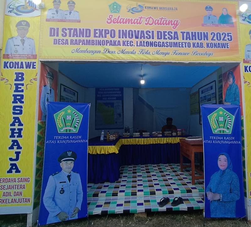 Ketgam: Kades Rapambinopaka, Lubis,S.E (kanan) bersama Perangkat desa di Stand Expo Inovasi Desa 2025.(Foto:IK). IKONSULTRA.COM : KONAWE – Pemerintah Desa (Pemdes) Rapambinopaka, Kecamatan Lalonggasumeeto, Kabupaten Konawe turut ambil bagian dalam Expo Inovasi Desa Konawe 2025 yang berlangsung di pelataran STQ Unaaha, sejak 5 hingga 10 November 2025.