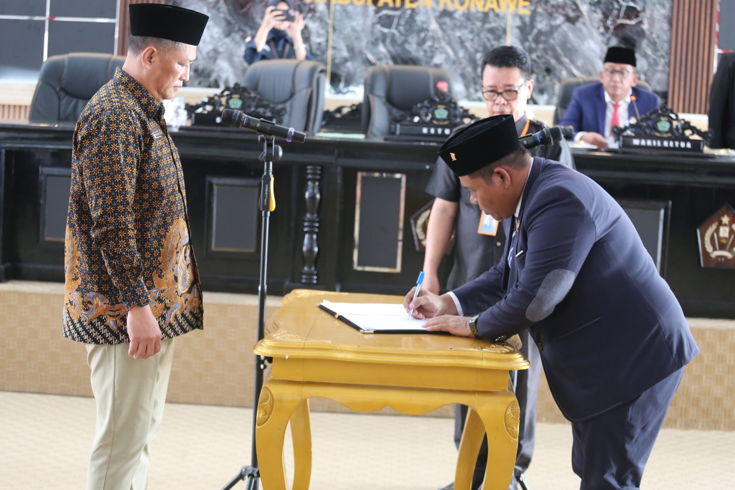 Ketua DPRD Konawe, I Made Asmaya bersama Sekda Konawe, Ferdinand menandatangani kesepakatan Raperda APBD 2024. IKONSULTRA.COM : KONAWE – Dewan Perwakilan Rakyat Daerah (DPRD) Kabupaten Konawe mengadakan rapat paripurna dengan agenda utama penandatanganan Nota Kesepahaman terkait Rancangan Peraturan Daerah (Raperda) tentang Laporan Pertanggungjawaban Pelaksanaan APBD Tahun Anggaran 2024, Jumat (04/7/2025).