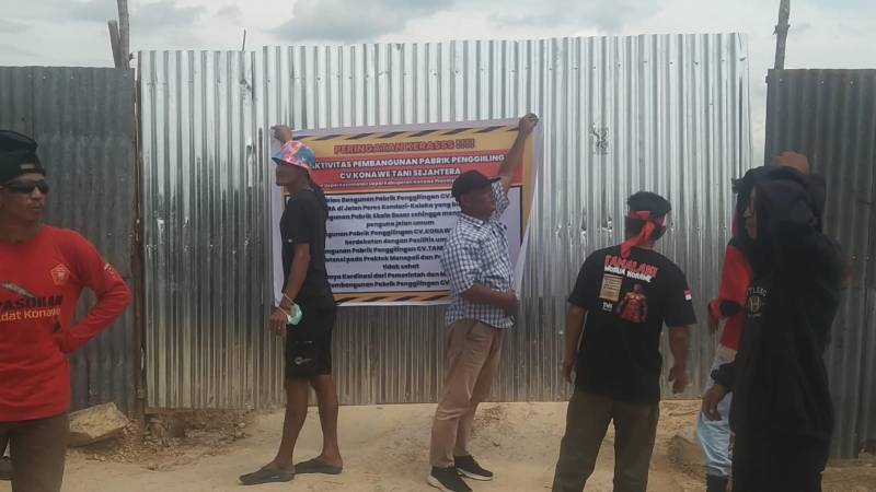 IKONSULTRA.COM : KONAWE – Tidak adanya tanggapan dari Pemerintah Kabupaten Konawe terhadap aspirasi penolakan warga memicu aksi lanjutan. Ratusan warga yang tergabung dalam Forum Komunikasi Antar Suku dan Agama (Forkasa) bersama sejumlah organisasi masyarakat adat melakukan penyegelan lokasi pembangunan pabrik penggilingan padi milik CV Konawe Tani Sejahtera di Kecamatan Uepai, Kabupaten Konawe, Sulawesi Tenggara, Senin, (22/12/2025).